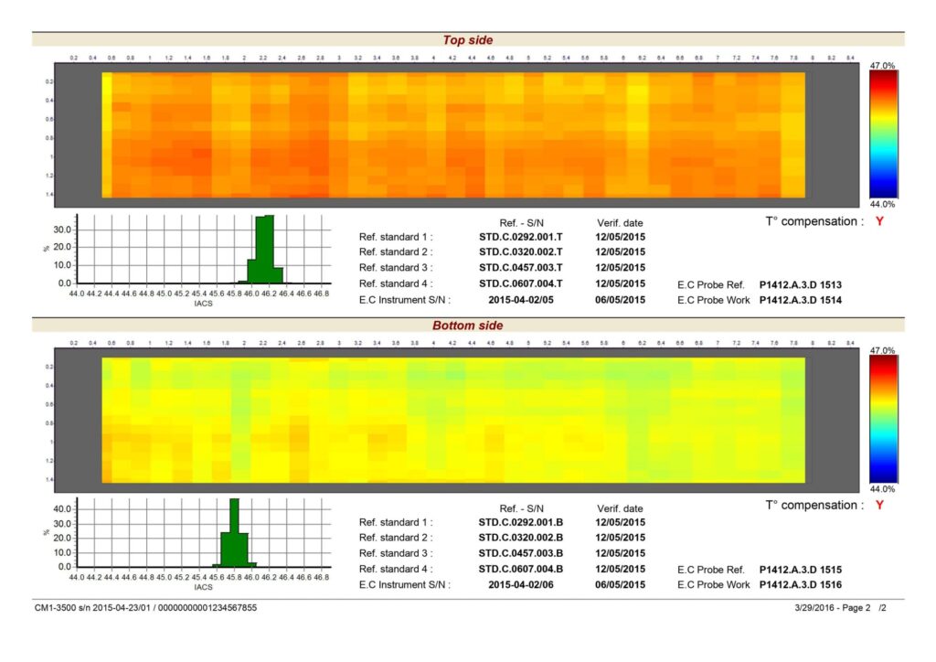 The color variation is representative of the presence and importance of defects, defect size or conductivity measurement value dispersion.