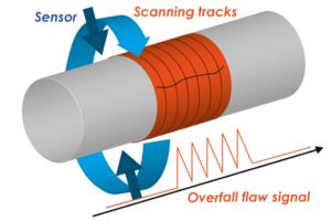 The product passes in translation through the rotating head. Two or four Eddy Current sensors inside the head are rotated around the product to search for longitudinal defects. Inspection is performed with a helical pitch over the entire surface of the product.