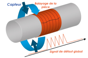 Le produit passe en translation au travers de la tête rotative. Deux ou quatre capteurs Courants de Foucault, à l’intérieur de la tête, sont mis en rotation autour du produit pour la recherche de défauts longitudinaux. L’inspection est réalisée avec un pas hélicoïdal sur toute la surface du produit.